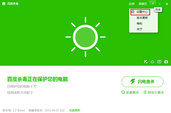 百度杀毒要查找设置中心,点击首页右上角的倒三角符号即可打开设置中心。百度杀毒的设置中心包含“基本设置”、“查杀设置”、“实时监控设置”、“白名单设置”四个设置选项。可以通过不同的设置选项设置软件的功能,比如选择处理病毒方式、升级方式等。
