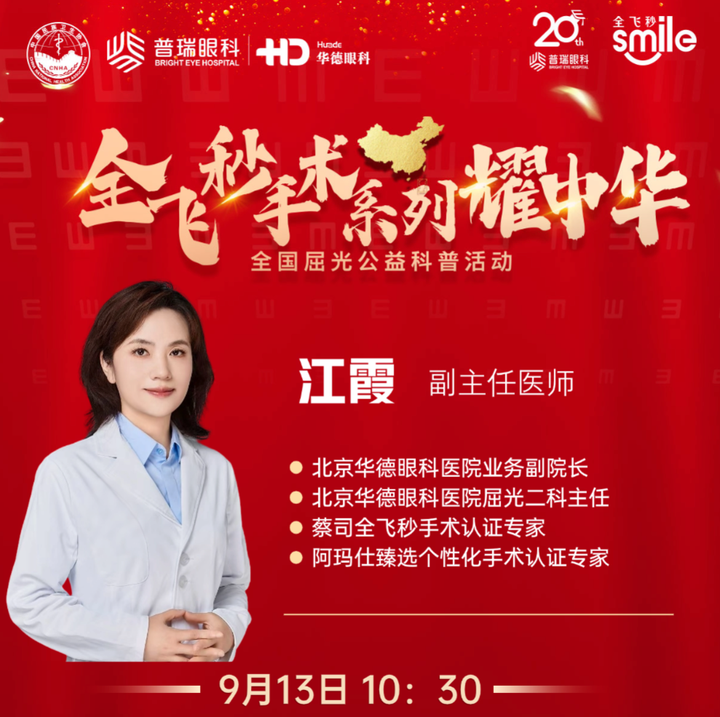 2025年9月13日,由中国民族卫生协会主办、卡尔蔡司(上海)管理有限公司支持、北京华德眼科医院承办的全飞秒手术系列耀中华全国屈光公益科普活动即将开启第二场专题讲座。本次活动邀请北京华德眼科医院业务副院长江霞院长担任主讲,聚焦现代人对视觉质量的新需求,带领大家深入了解当代近视矫正技术如何满足个性...