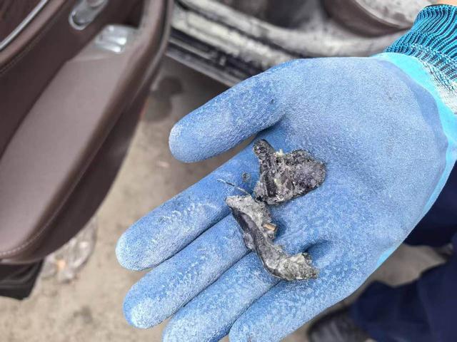 之后,对起火部位更细致的勘察后,火调人员在车座位下方的角落里找到一个打火机的残骸。