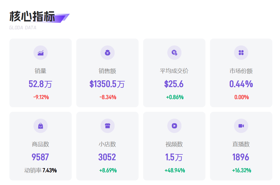此外,市场上的商品数为9587个,动销率为7.43%;小店数为3052家,动销率为8.69%。这些数据表明,尽管整体销量有所下降,但市场上活跃的商品和店铺数量却在增加。这可能反映了市场竞争的加剧,以及新进入者对市场的积极布局。视频数和直播数分别达到了1.5万和1896,环比增长分别为48.94%和16.32%。这显示出TikTok平台上的视频和直播推广正在成为提高品牌曝光度和互动参与的重要手段。